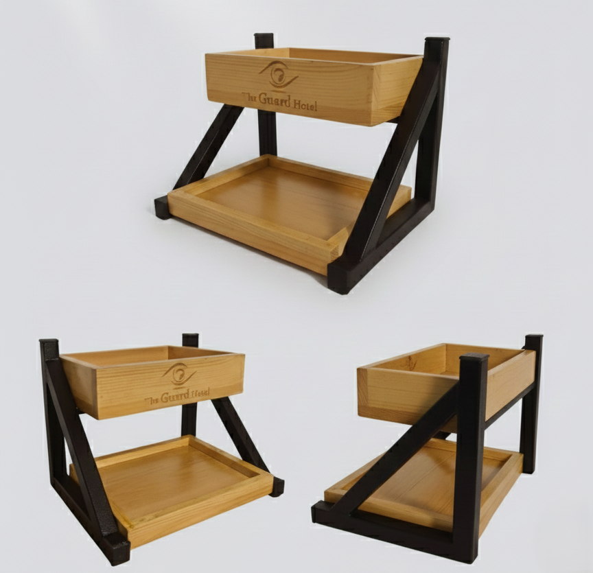 Designed for the modern hospitality industry, this dual-tier stand combines a heavy-duty steel chassis with high-quality natural wood trays. The metal frame is finished with a professional anti-rust coating, while the wooden tiers are moisture-resistant and safe for food presentation. Its tiered design saves valuable table space and provides a clear, appetizing view of your products. With custom branding options available, it’s a must-have piece for hotels and upscale diners looking to impress their guests.